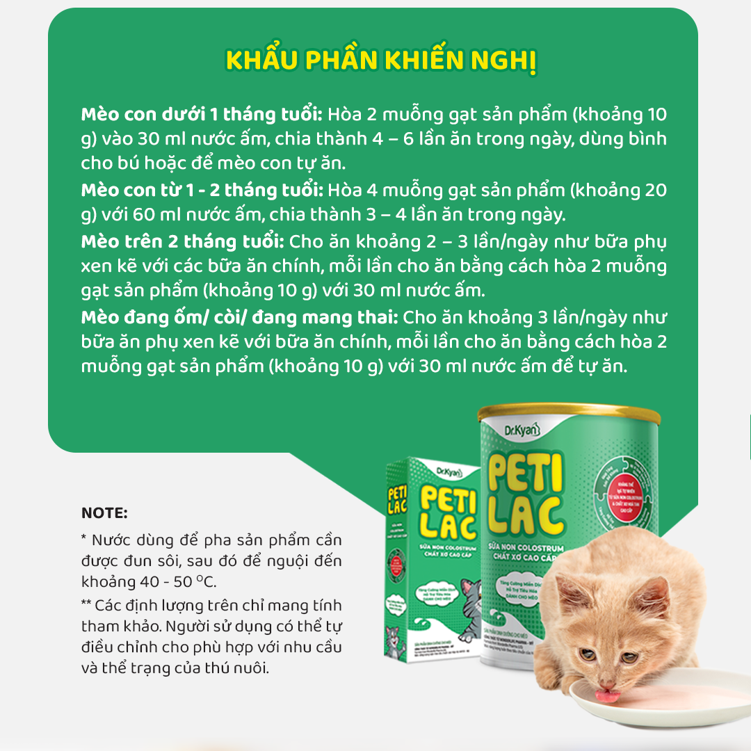 - Mèo con dưới 1 tháng tuổi: Hòa 2 muỗng gạt sản phẩm (khoảng 10 g) vào 30 ml nước ấm, chia thành 4 – 6 lần ăn trong ngày, dùng bình cho bú hoặc để mèo con tự ăn.